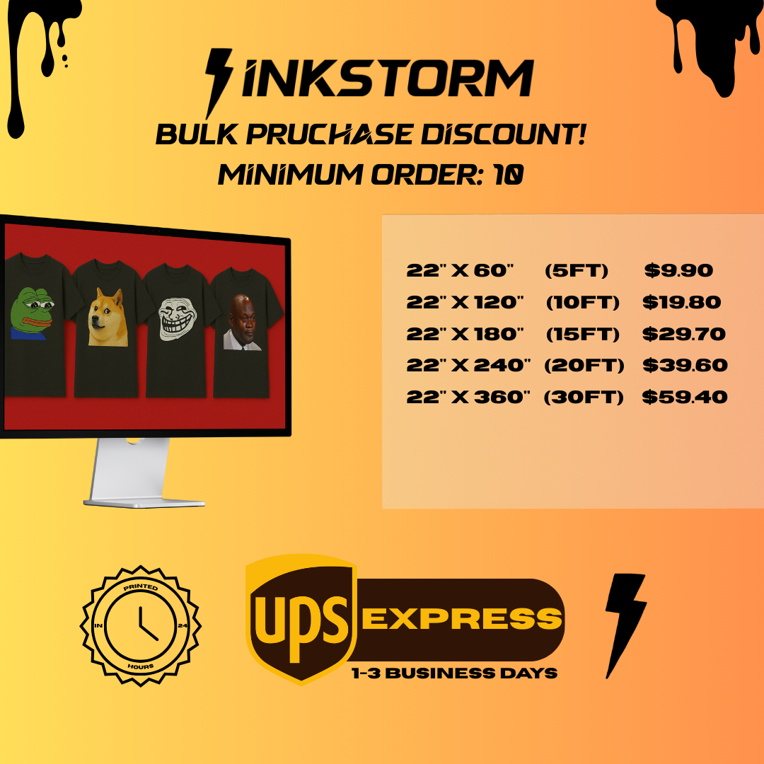 Take advantage of INKSTORM DTF’s exclusive bulk pricing and get the best value in the industry. Whether you're producing for clients or creating for yourself, our high-resolution DTF sheets deliver exceptional results without the premium price tag.